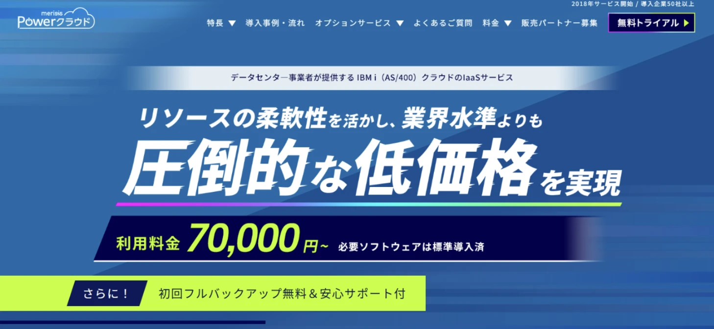 「merisis Powerクラウド」は、低コストかつ高品質なAS400(IBM i)クラウド移行を実現したい企業に適したサービスです。月額約7万円から導入可能で、初回フルバックアップや24時間365日の有人サポートが標準装備されており、運用面の安心感が高い点が魅力です。