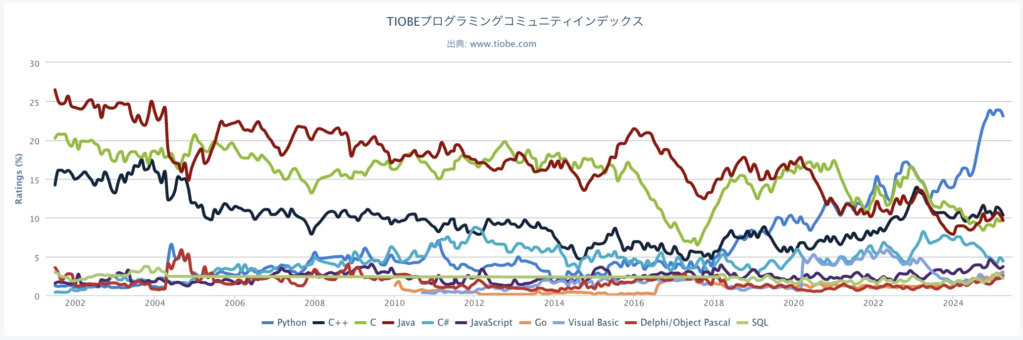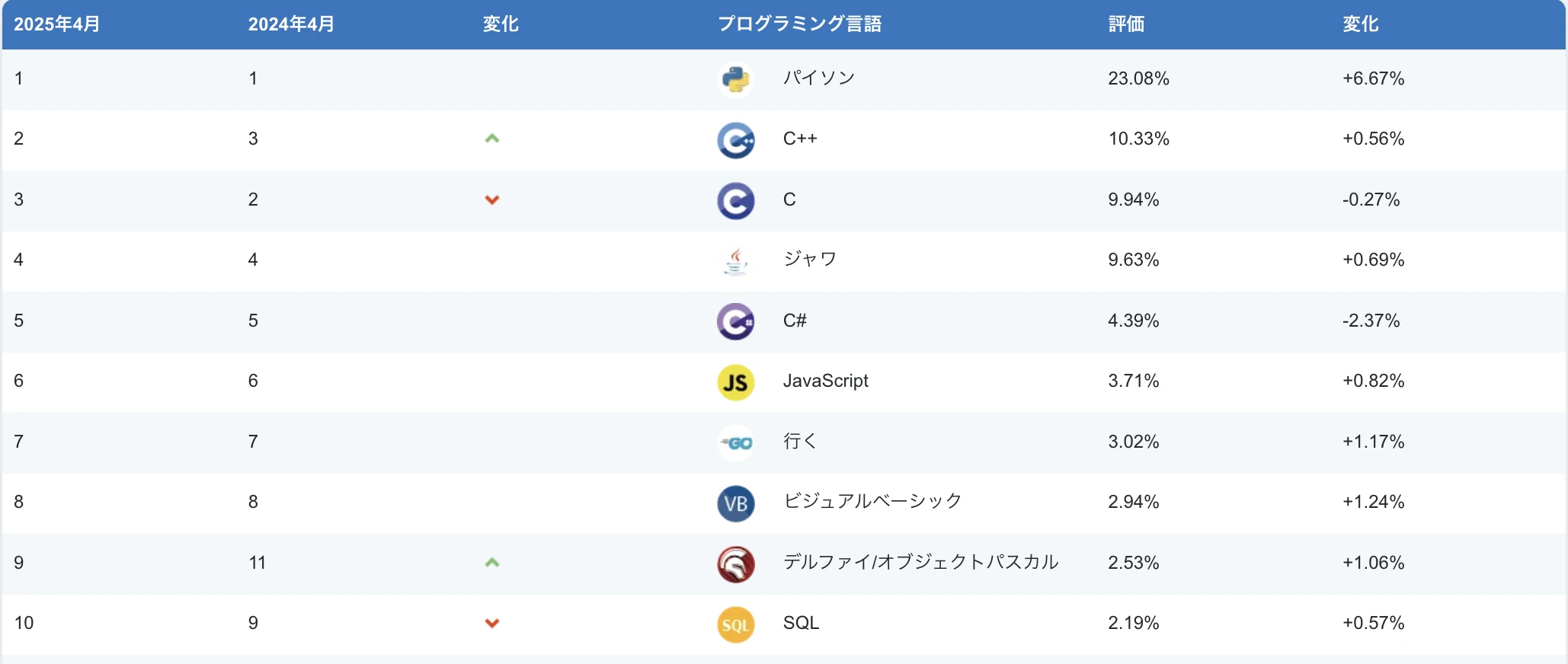 プログラミング言語ランキングでは、1位がPython(パイソン)、2位はC++、3位がJava、4位はC、5位がC#という結果となっており、C系言語が上位を占めていることがわかります。C++がCを初めて上回る形となりました。