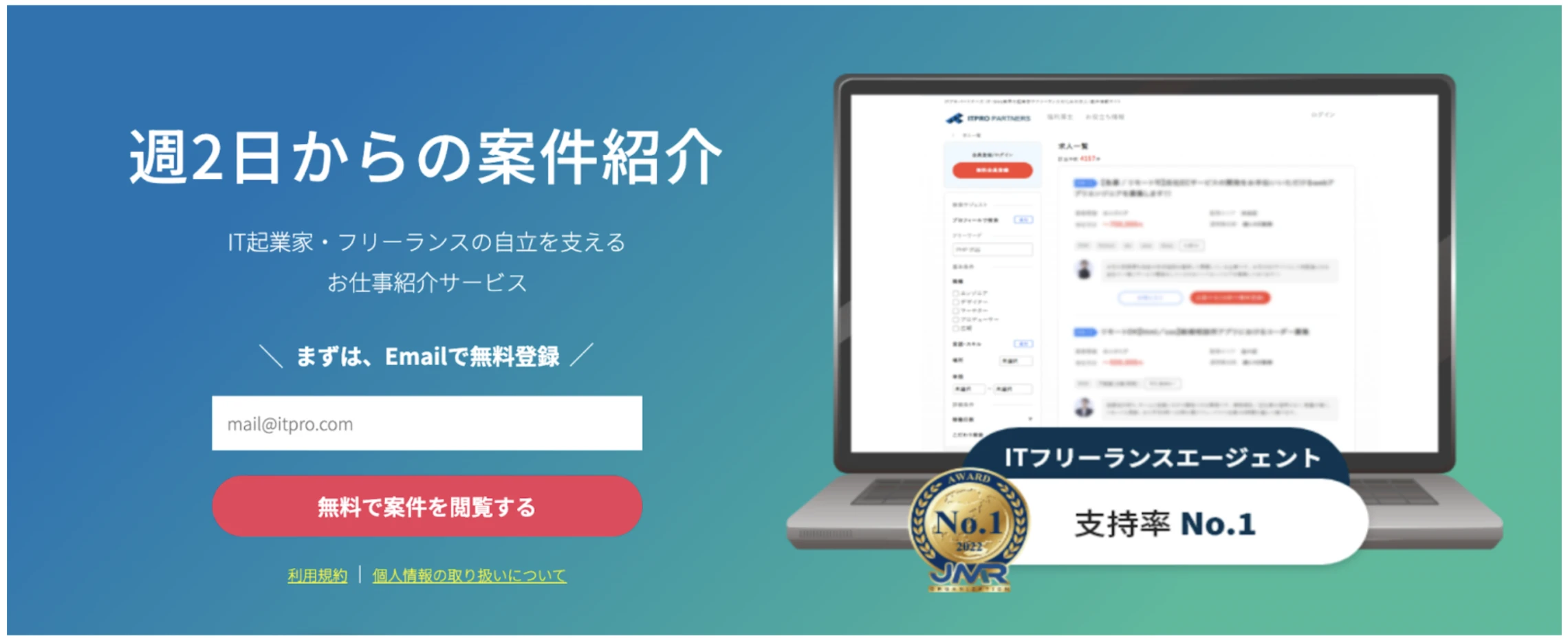 ITPRO PARTNERSは、週2から働ける案件の紹介もおこなっているフリーランスエージェントサービスです。少ない日数で働けるため、現在の案件にプラスで参画できる仕事を探している方も利用できます。