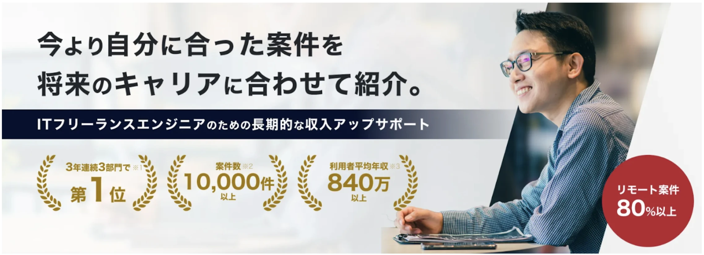 業界最高水準の「高単価案件」を多数保有しており、フリーランスとして独立して、年収を上げたい方に向いています。扱っている案件も多くは年齢不問なため、40代以上のエンジニアも年齢を気にせずにスキルや報酬などの希望条件に合わせた案件を探せます。