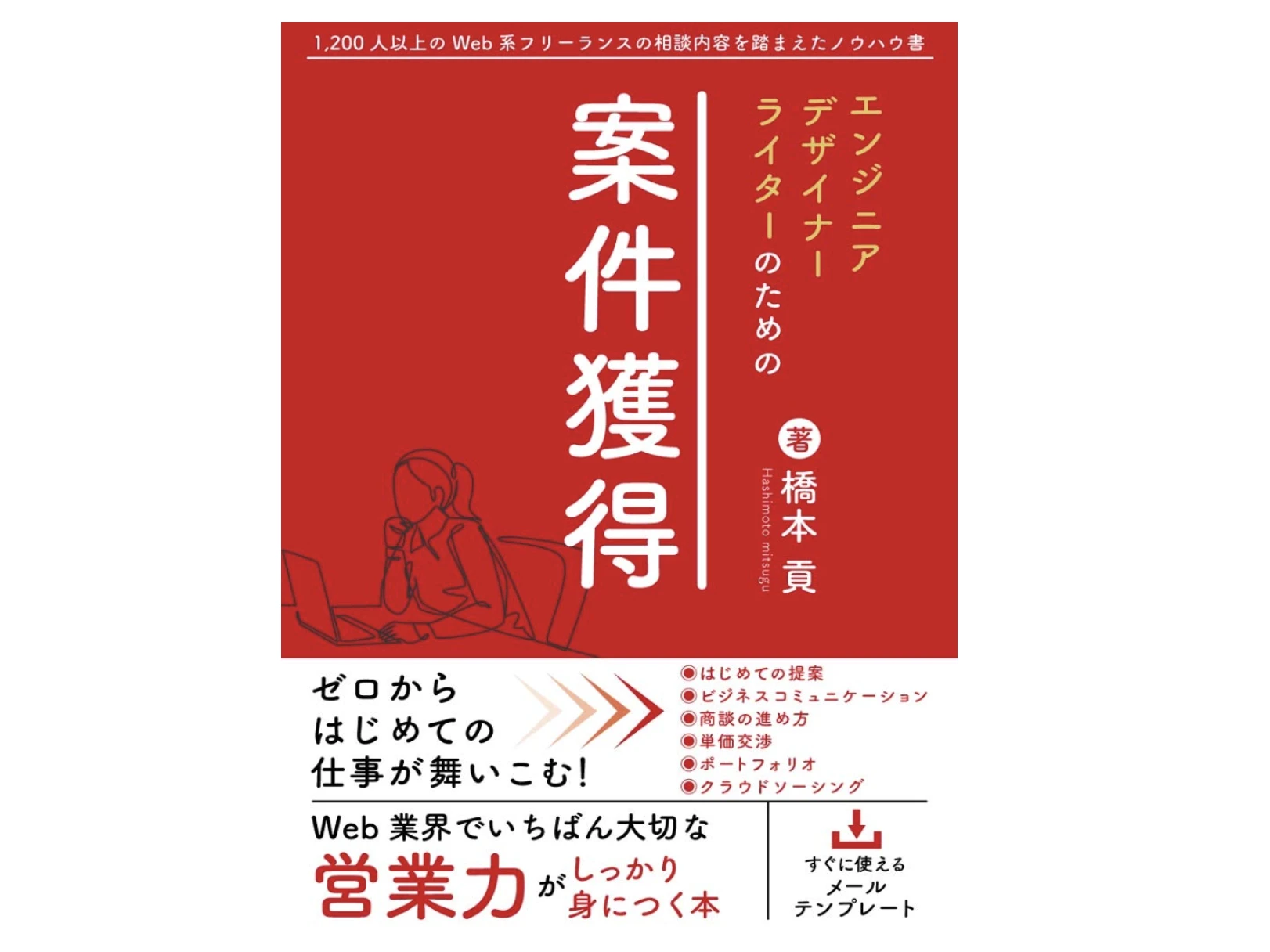 『エンジニア・デザイナー・ライターのための案件獲得』は、現役のWeb営業として1,200名以上のWeb系フリーランスとともに仕事をしてきた著者が、営業スキルを基礎から丁寧に解説した本です。