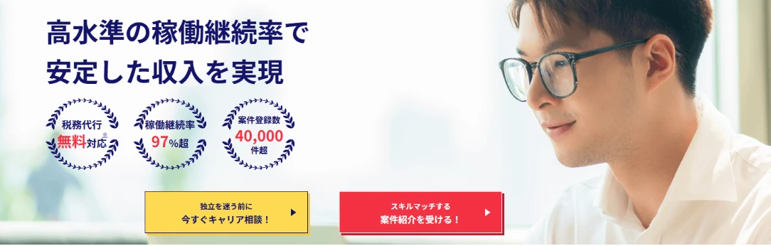 | 福利厚生・サポート内容 | 専属コーディネーターによるカウンセリング/案件紹介 案件参画後も定期フォローあり(ブランク期間防止) 税理士・FPによる税務/保険サポートあり(初めての独立でも安心) Web上に出ない非公開案件も豊富 中間マージンを抑えて高単価を実現 |