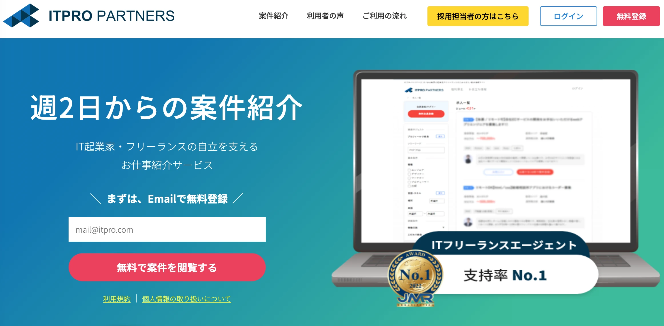 | ITPRO PARTNERS | ・週2〜3日勤務やフルリモート案件が豊富 ・エンド直請で高単価も狙える | 6,700件 | 35日 |
