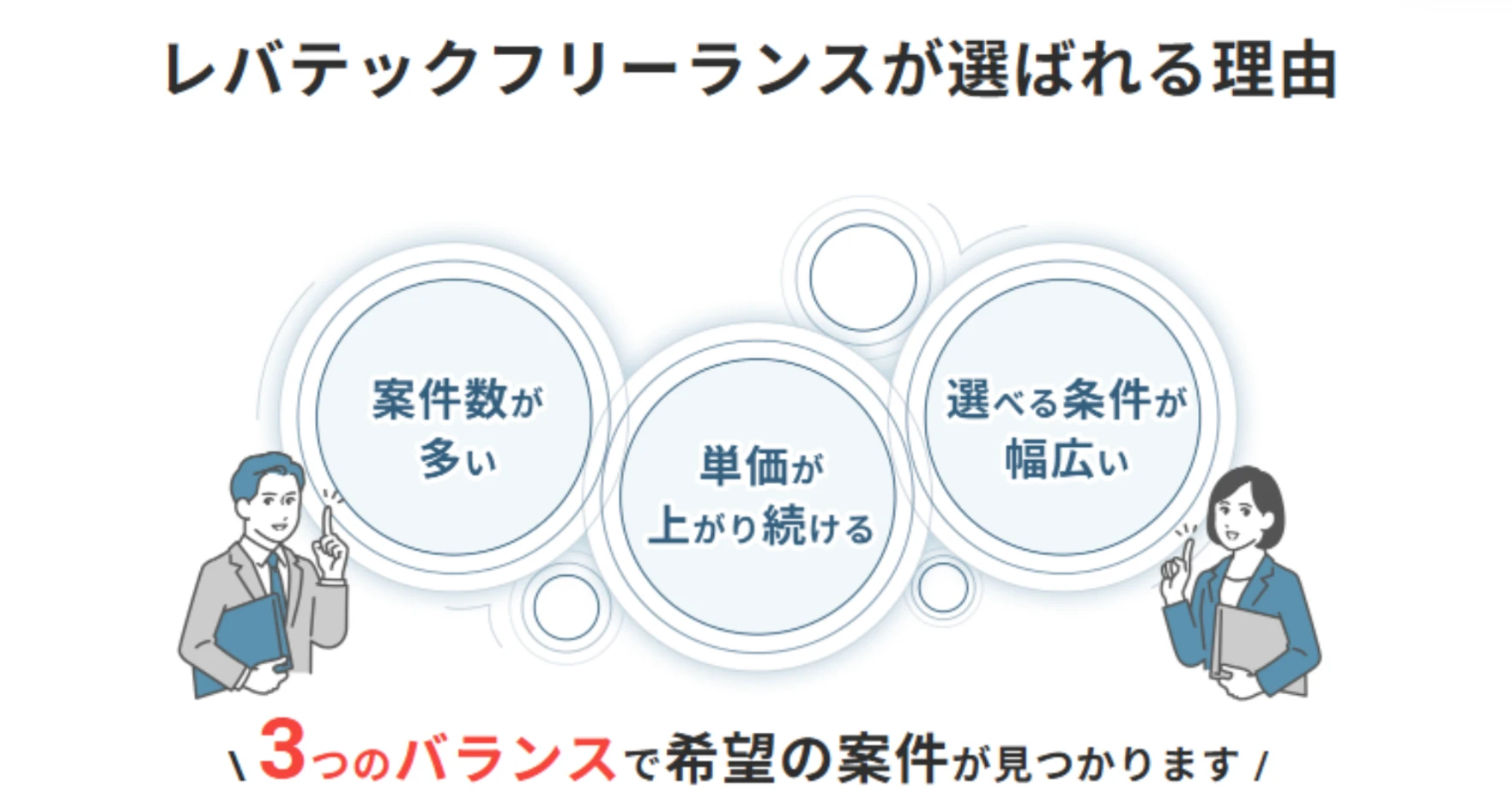案件を受注し稼働していくことで、実績や評価が蓄積されるシステムを取っているという特長があります。実績・評価が蓄積され高評価を得られるようになると、高単価案件や好条件な案件を受注できるようになるでしょう。