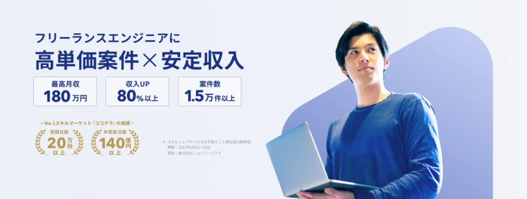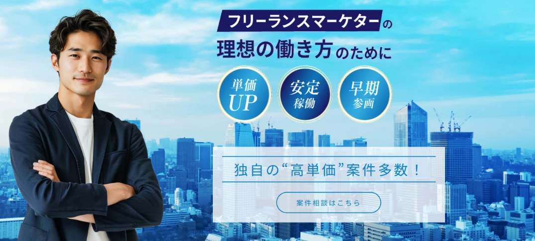 | 福利厚生・サポート内容 | 契約・請求処理をシステムで一元管理 マイページからスカウト受信、稼働状況管理、商談リマインダーなど利用可能 市場分析ダッシュボード機能あり 案件参画後も専任担当者がサポート |