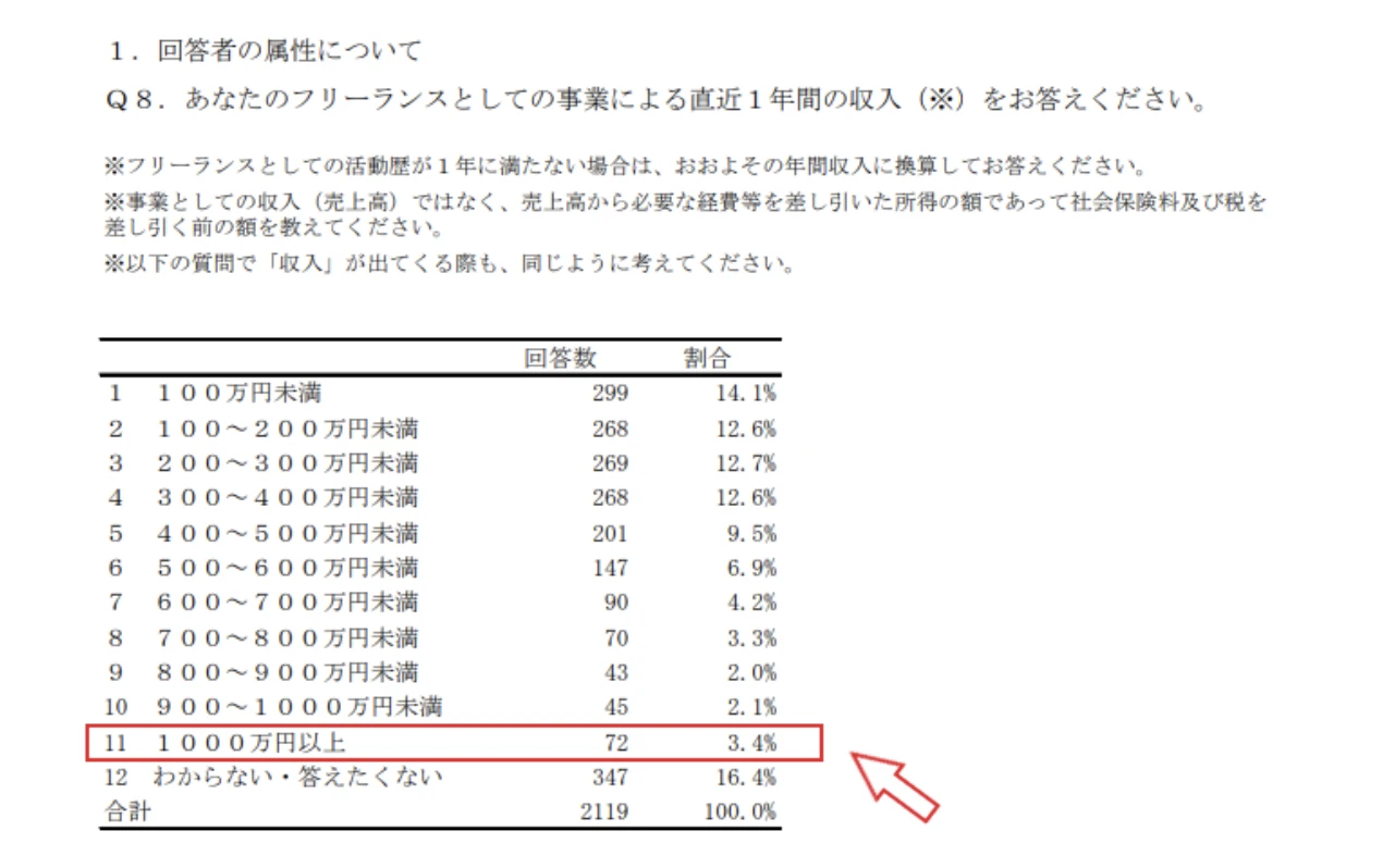 内閣官房が2,119名のフリーランスを対象として、令和4年8月に実施した「令和4年度フリーランス実態調査結果」によると、年収1,000〜2,000万円を超えるフリーランスは、全体の3.4%とほんの僅かだと分かりました。