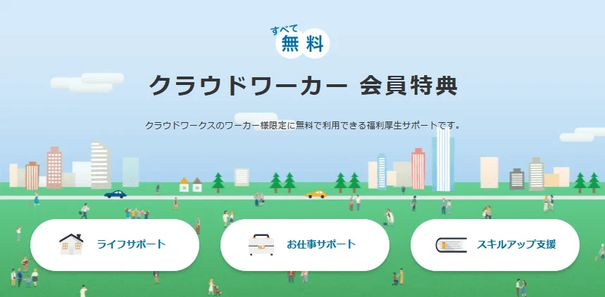 クラウドワークスのクラウドワーカー向け福利厚生サービスは、登録会員であれば誰でも無料で利用できる特典プログラムです。