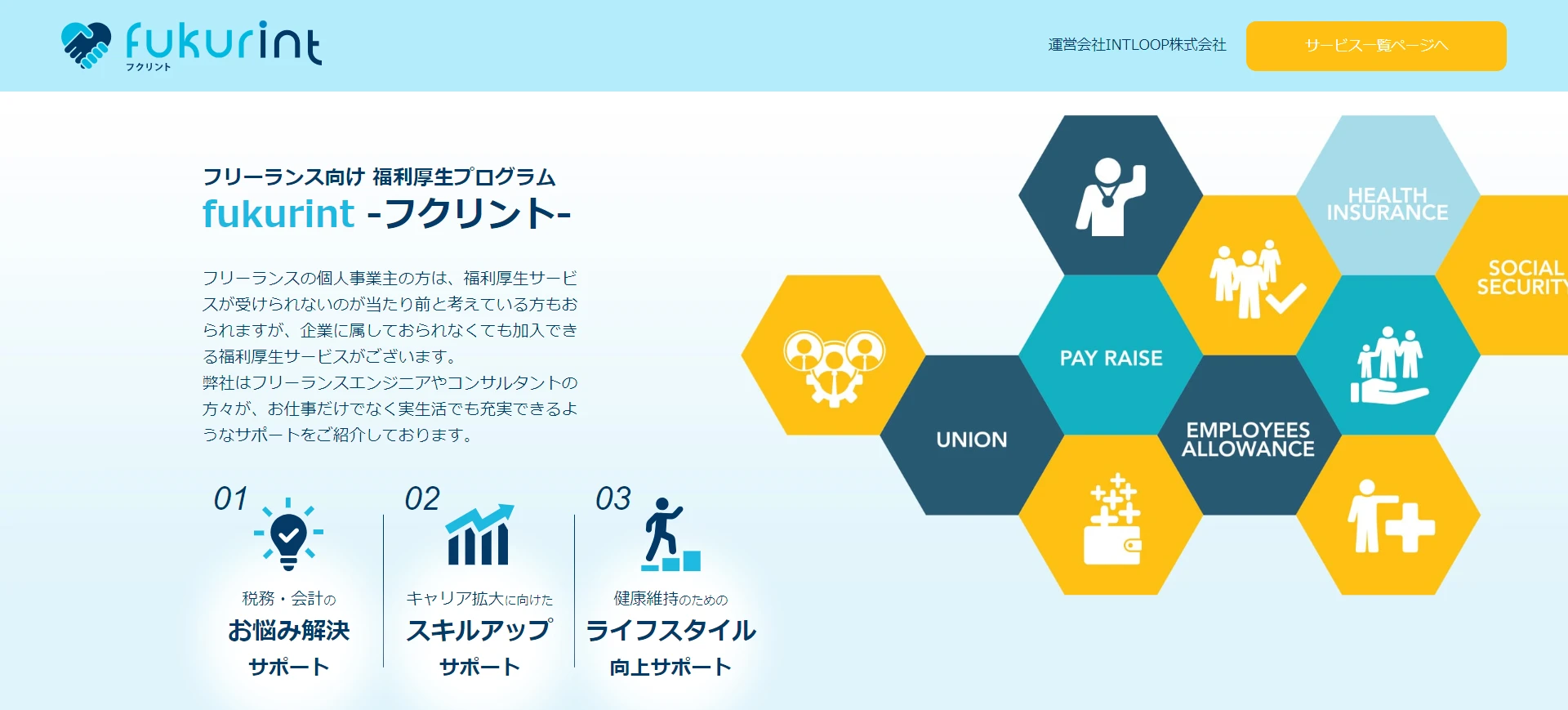 サービス内容 | 健康診断、税務相談、スキルアップ支援、キャリア相談、ライフサポート(今後拡充予定)など |