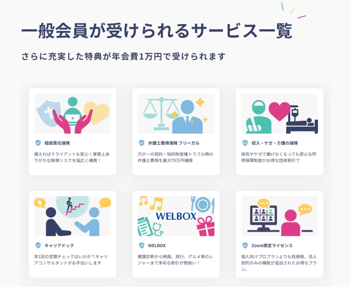 年会費1万円の一般会員になることで、賠償責任保険や弁護士費用保険、所得補償保険などの安心保証に加え、健康診断や映画・旅行の割引、キャリア相談や案件紹介、法務・税務サポートなど多彩な特典が利用可能になる点が魅力です。