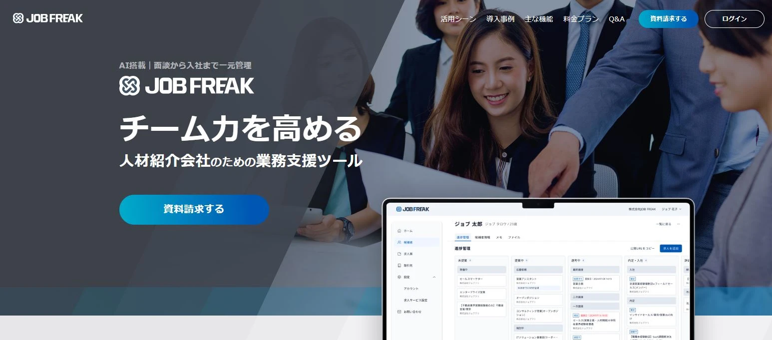 当社が提供する「JOB FREAK」(以下、ジョブフリ)は、紹介会社様が抱える煩雑な業務フローを一元管理できる革新的なサービスです。