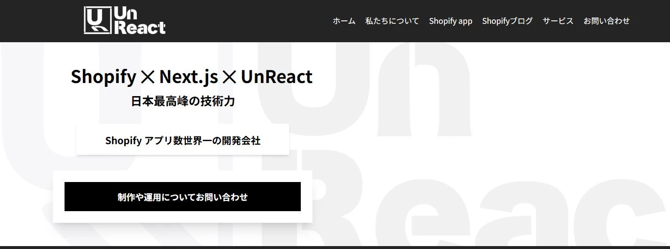 株式会社UnReactは、ShopifyとNext.jsを活用したヘッドレスコマースに強みを持つ、ECサイト制作・運用支援の専門企業です。旧帝大以上の技術力を備えたエンジニアが在籍し、高速表示と高いコンバージョンを実現するサイト構築を行っています。